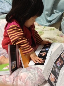 おもむろに本棚からフォトブックを取り出しては、「あー!」と何かを訴えるYUI。