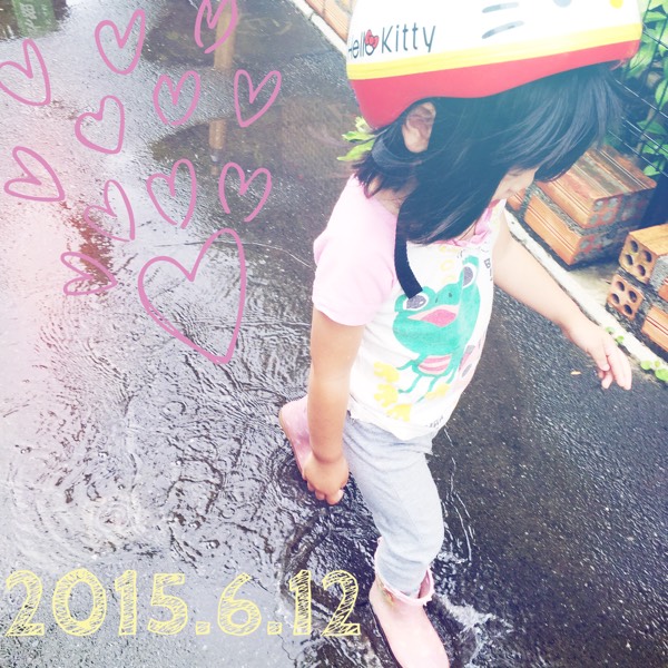雨は小降りになり、次女は水たまりに足を入れて大はしゃぎ。